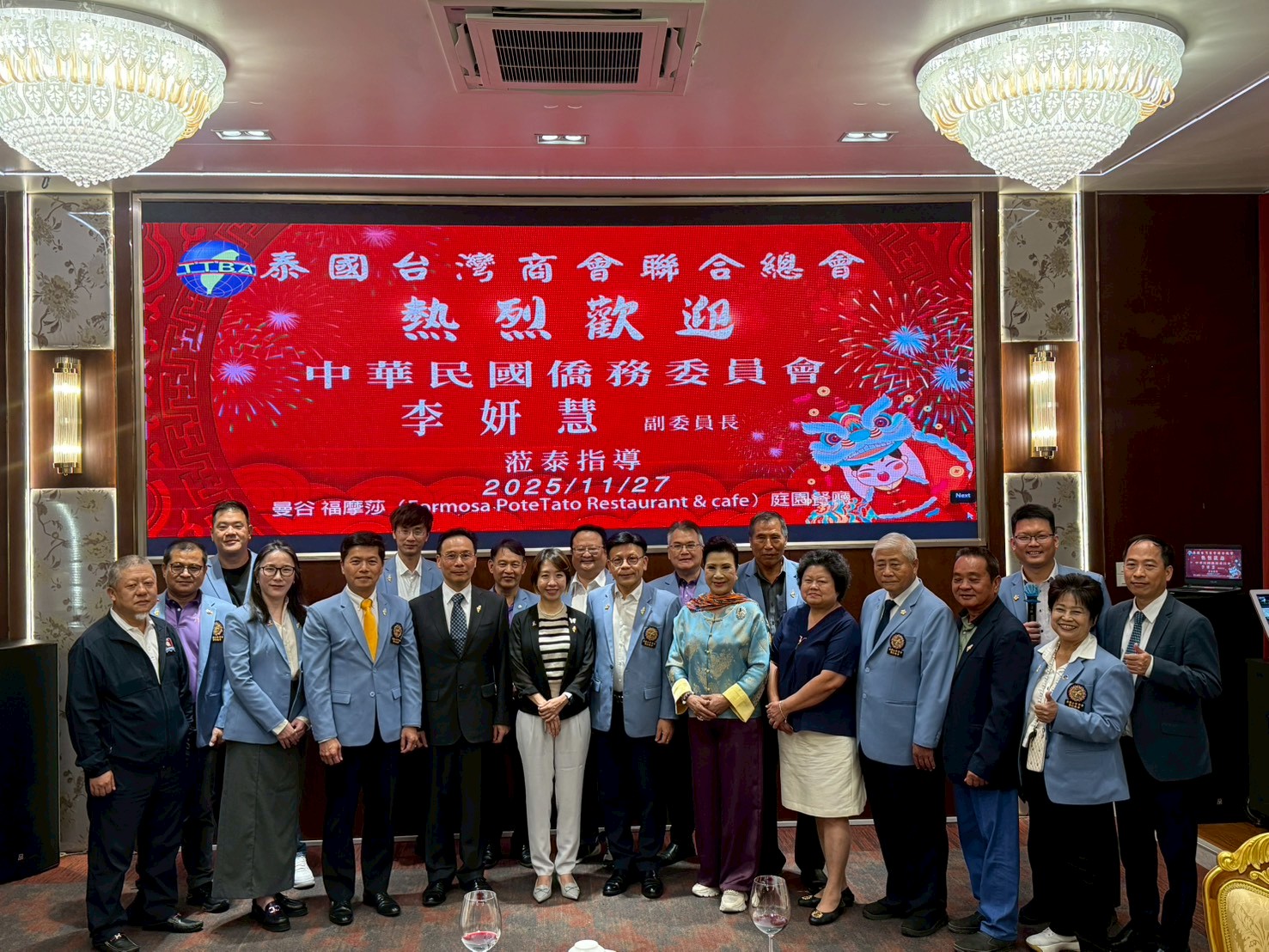 2025年11月27日(四)僑委會李妍慧副委員長蒞泰指導暨餐敘。泰國台灣商會聯合總會總會長陳漢川、監事長章維斌、副總會長:洪勝統、陳俊蓁、張桂銘、楊源輝、謝文桂、副監事長盧朝勖、榮譽總會長:呂生意、林來好、黃員教、陳明仁、呂坤霖、林如茵、副財務長温德農、秘書長劉昌奇、副秘書長:黃秀蘭、黃啓富、張正杰、顧問:余奕錦、李孟彥及理事林秋美。中華民國駐泰國代表處藍大使夏禮閣下 、中華民國僑務委員會副委員長李妍慧及中華民國駐泰國代表處僑務組組長許世榕蒞總商會指導。