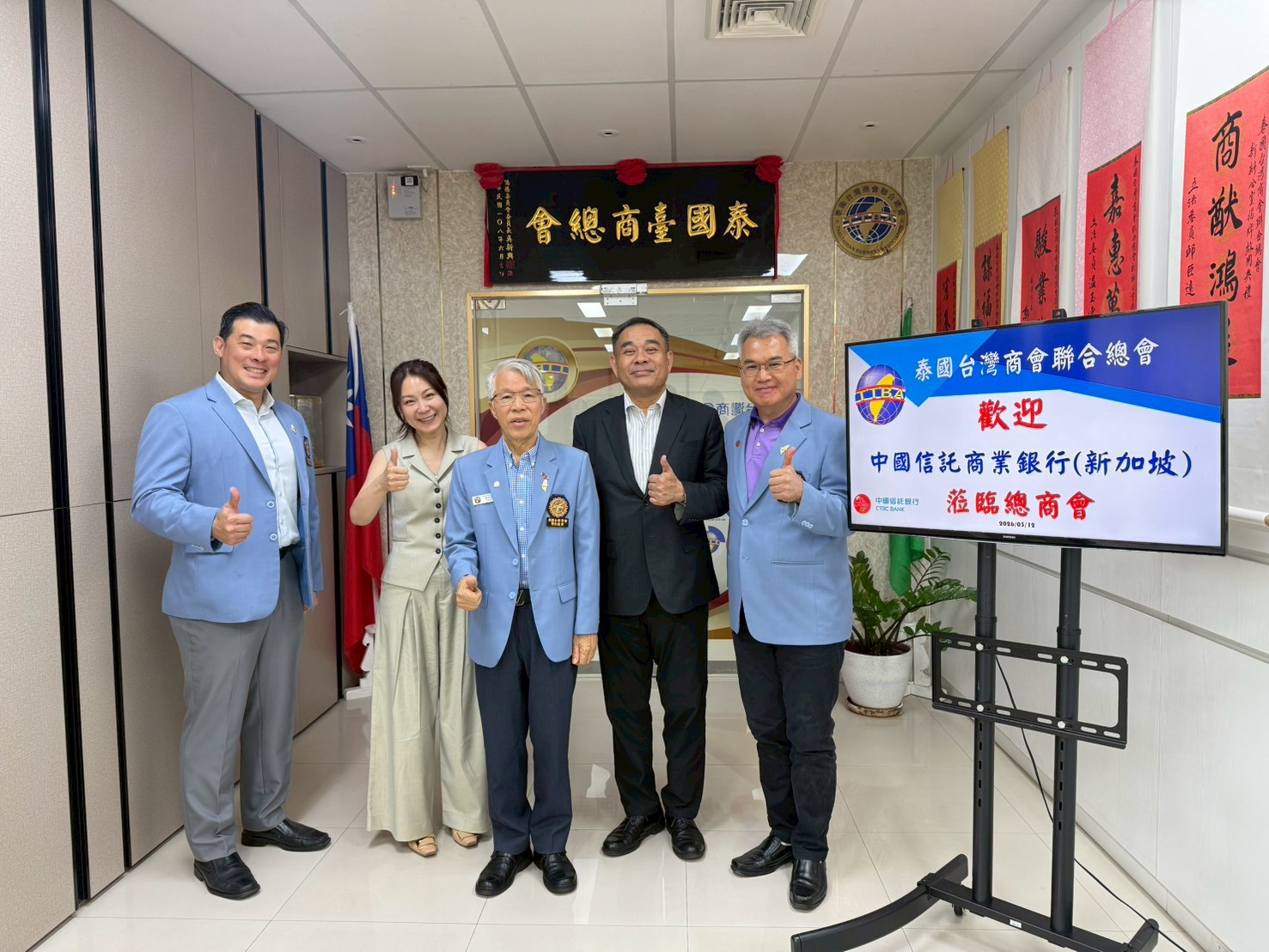 2026年3月12日(四)中國信託商業銀行(新加坡)拜會。泰國台灣商會聯合總會副總會長葉明進、吳順國及秘書長張正杰出席此次拜會。中國信託商業銀行(泰國)總經理于迺文、中國信託商業銀行(新加坡)執行董事行銷主管 林立青、董事行銷主管黃敏華來訪拜會。拜訪目的:商討一下未來想在曼谷辦一場財富管理室人銀行的研討會日期的安排等等。